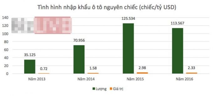 Theo số liệu vừa công bố của Tổng cục Hải quan, người Việt đã chi 2,33 tỷ USD nhập khẩu 113.567 ô tô nguyên chiếc trong năm 2016.Nếu so với năm 2015, mặt hàng này đã giảm 9,5% về lượng và 21,7% về giá trị. Năm 2015 kim ngạch nhập khẩu ô tô là 2,98 tỷ USD với 125.534 chiếc.