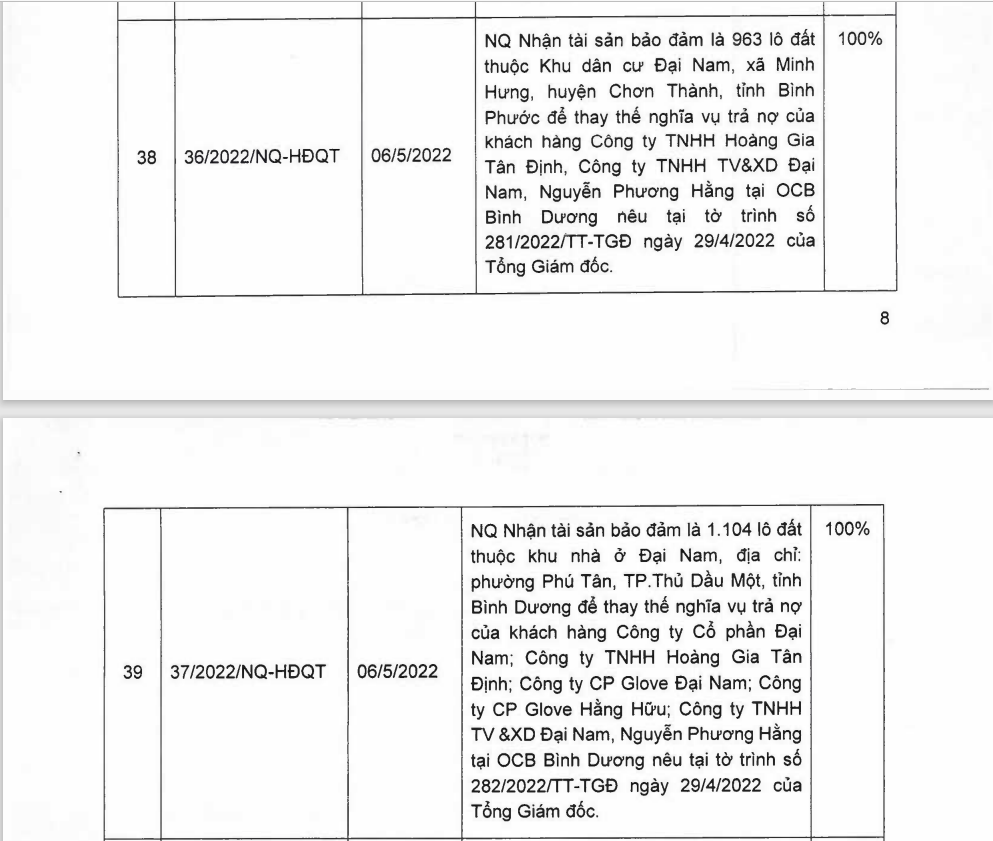 Cụ thể, Nghị quyết số 36/2022/NQ-HĐQT nhận tài sản đảm bảo là 963 lô đất thuộc Khu dân cư Đại Nam, xã Minh Hưng, huyện Chơn Thành, tỉnh Bình Phước để thay thế nghĩa vụ trả nợ của khách hàng Công ty TNHH Hoàng Gia Tân Định, Công ty TNHH TV&XD Đại Nam, bà Nguyễn Phương Hằng tại OCB Bình Dương nêu tại tờ trình số 281/2022/TT-TGĐ ngày 29/4/2022 của Tổng Giám đốc.