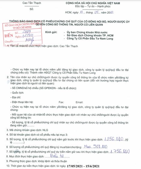 Phương thức giao dịch là khớp lệnh và thỏa thuận, dự kiến từ ngày 17/5 đến ngày 15/6/2021. Nếu giao dịch thành công, ông Thạch sẽ nâng sở hữu tại NLG từ gần 1,26 triệu cổ phiếu lên 1,76 triệu cổ phiếu.