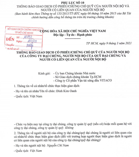 Ông Đinh Kim Oanh - bố vợ ông Nguyễn Chí Nam - Thành viên HĐQT CTCP Vận tải Xăng dầu Vitaco (MCK: VTO) vừa đăng ký bán 1 triệu cổ phiếu VTO.