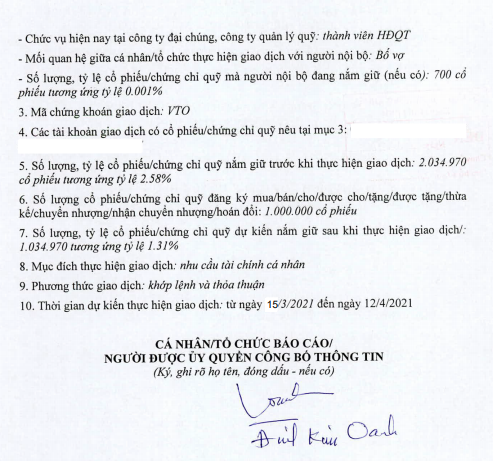 Trước đó, ông Oanh cũng đăng ký bán 1 triệu cổ phiếu VTO từ ngày 22/01 - 21/02/2021 nhưng bất thành do giá không đạt kỳ vọng.