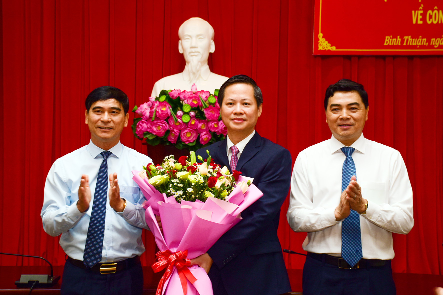 Ông Dương Văn An - Bí thư Tỉnh ủy Bình Thuận bìa trái tặng hoa chúc mừng ông Đoàn Anh Dũng