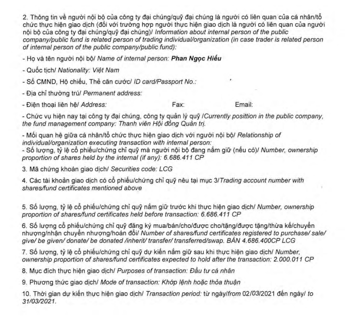 Trước khi thực hiện giao dịch trên, ông Hiếu nắm giữ gần 6.7 triệu cổ phiếu. Như vậy, nếu giao dịch trên thành công, ông Hiếu chỉ còn nắm giữ gần 2 triệu cổ phiếu tại LCG.