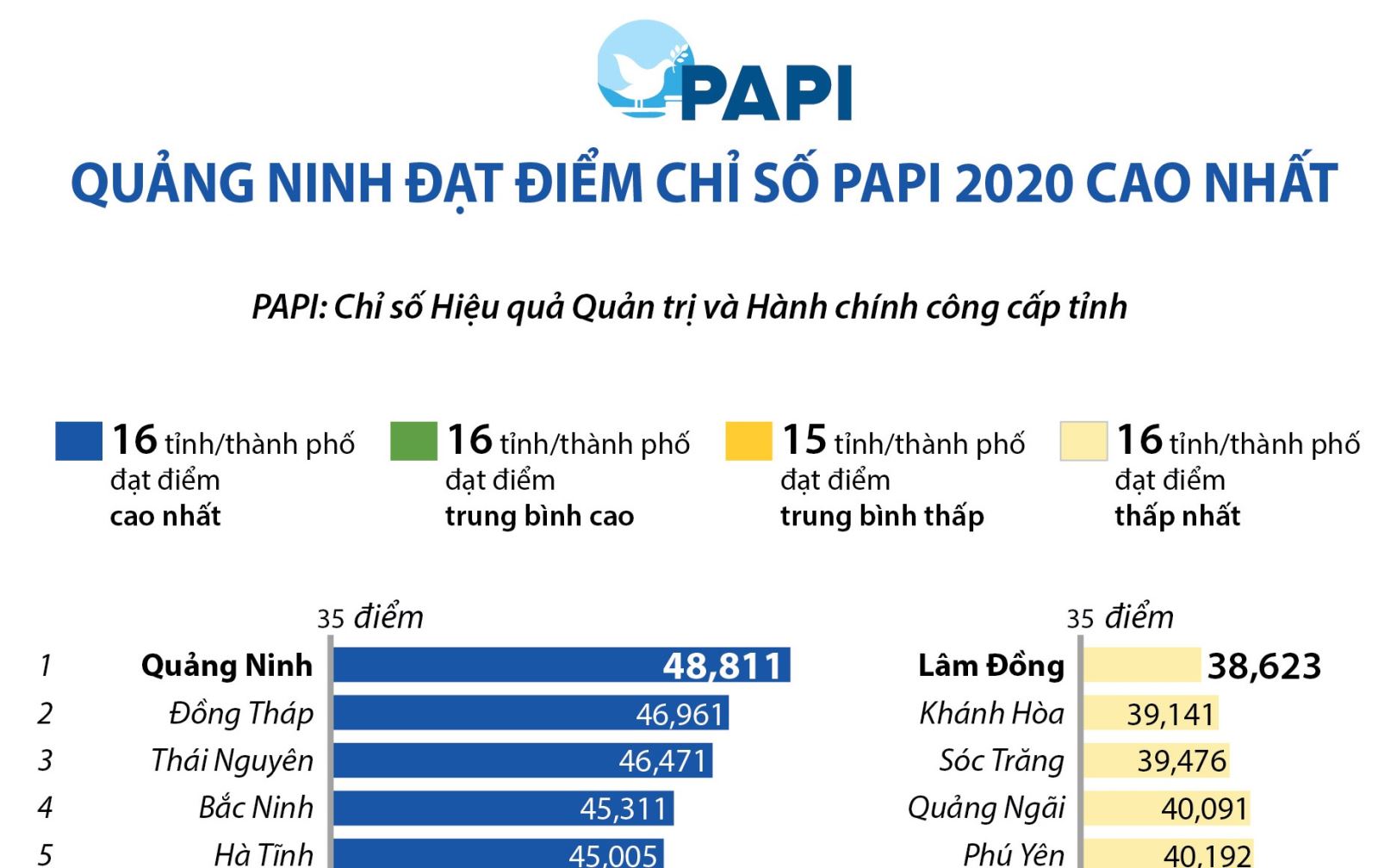 Theo đó, năm 2020, không có tỉnh, thành phố nào trong số 63 tỉnh, thành phố nằm trong nhóm đạt điểm cao nhất ở cả tám chỉ số nội dung thành phần kể trên. Tuy nhiên, đáng chú ý, khi xét điểm PAPI tổng hợp, tỉnh Quảng Ninh đã vươn lên dẫn đầu xếp hạng PAPI 2020 với tổng điểm 48,811.