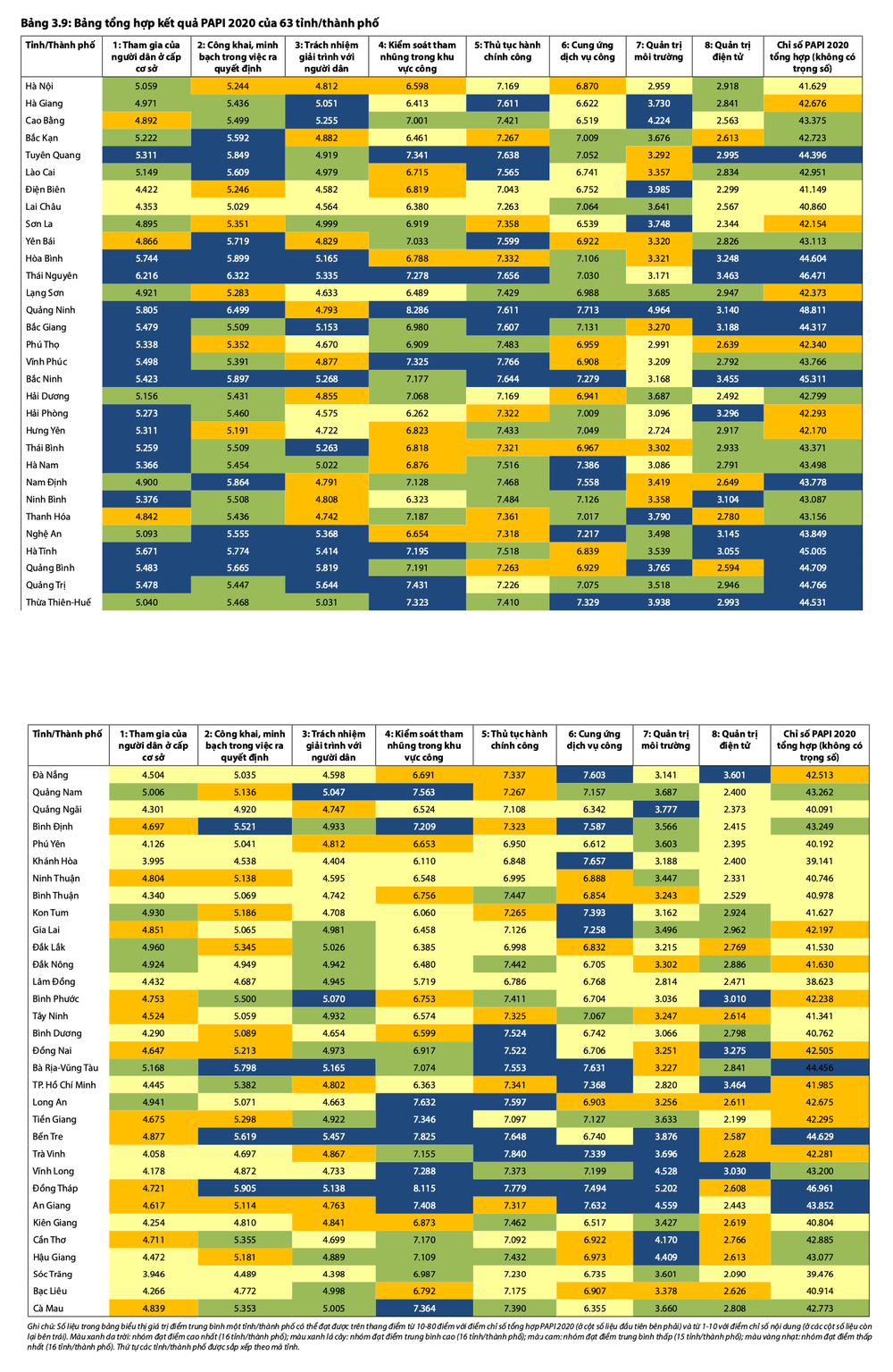Bảng tổng hợp kết quả PAPI 2020 của 63 tỉnh, thành phố.