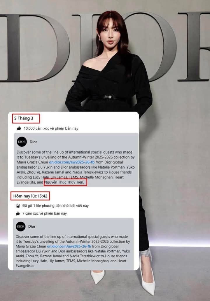 Tuy nhiên mới đây, sau hơn 1 tháng bị tạm hoãn xuất cảnh, phía Dior lại có động thái "quay xe" với Thùy Tiên. Cụ thể, tối 22/4, nhiều người hâm mộ phát hiện Dior đã âm thầm hiển thị lại tấm ảnh của Hoa hậu Thùy Tiên tại sự kiện ra mắt bộ sưu tập Thu - Đông 2025 trên nền tảng mạng xã hội Facebook.
