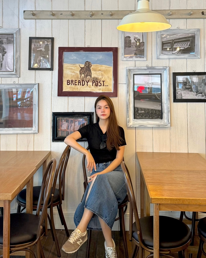 Khi muốn nữ tính hơn, cô đổi sang chân váy denim xẻ tà cùng áo thun đen và sneaker xám. Công thức này vừa hiện đại vừa trẻ trung.