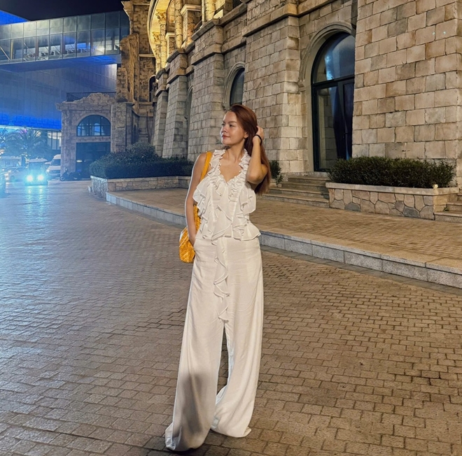 Khi muốn bay bổng, cô chọn áo bèo nhún điệu đà kết hợp jeans xanh bụi bặm, nhấn nhá thêm sandal ánh kim và vòng cổ vàng. Lúc khác, một chiếc áo tank top ôm dáng phối quần denim trắng lại mang đến vẻ trẻ trung, năng động.