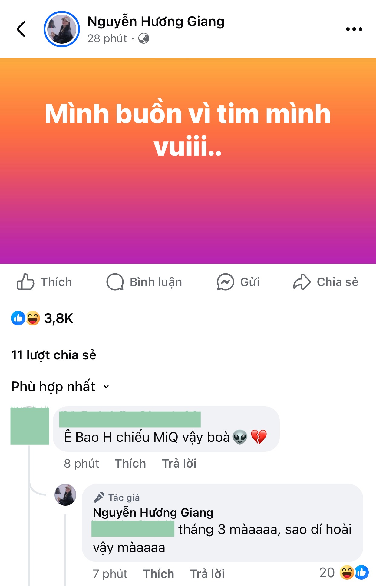 Trước câu hỏi "Bao giờ chiếu Miss International Queen Vietnam vậy?", Hương Giang không né tránh mà phản hồi thẳng thắn: "Tháng 3 mà, sao dí hoài vậy mà". Câu trả lời có phần "bất lực" của Hương Giang nhanh chóng gây chú ý, nhất là khi ồn ào của Phạm Thoại vẫn chưa có dấu hiệu hạ nhiệt.