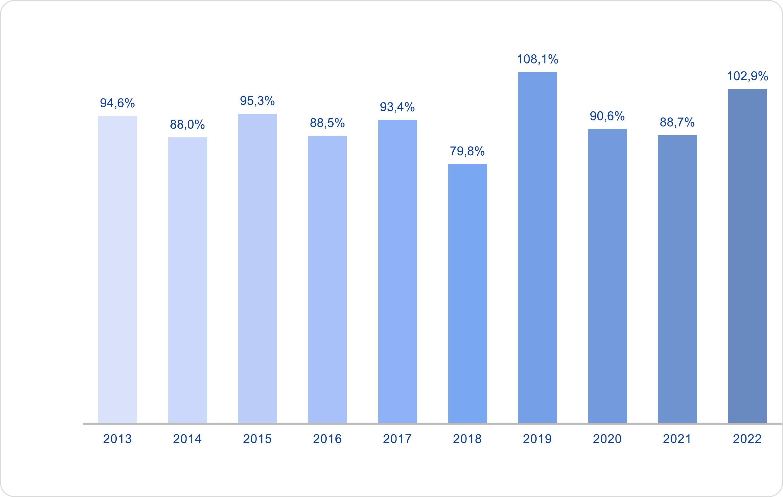 Tỷ lệ Dòng tiền từ hoạt động kinh doanh/lợi nhuận sau thuế từ 2013 đến 2022. Nguồn: VNM