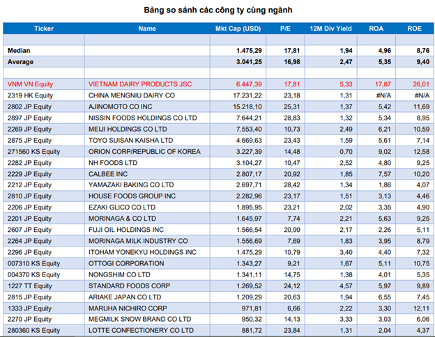 Nếu nhìn rộng ra hơn khi so sánh với các doanh nghiệp F&B trên thế giới, thống kê của Chứng khoán Bảo Việt (BVS) cho thấy VNM có được tỷ suất sinh lời ROA và ROE ghi nhận trong năm 2022 lần lượt 26% và 17%, kết quả này vượt trội hơn rất nhiều đại gia F&B nổi tiếng như Meji (Nhật Bản), Morinaga (Nhật Bản), Lotte (Hàn Quốc), Otion (Hàn Quốc), Mengniu Dairy (Trung Quốc)…