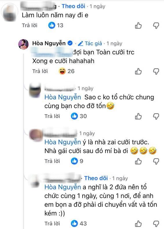 Về phía giọng ca Bắc Bling, ngay khi cư dân mạng nghi ngờ danh tính chú rể là Văn Toàn, Hòa Minzy đã phải đi phản hồi từng bình luận, ngầm phủ nhận chuyện yêu đương: "Đợi khi nào Toàn lấy vợ xong em mới cưới", "Khổ, không phải cưới Văn Toàn nhé. Nhanh cho nó vuông", "Trời ơi, bài đăng này không có ẩn ý gì hết nhé. Không phải cưới Văn Toàn đâu nên mọi người khỏi đồn",...