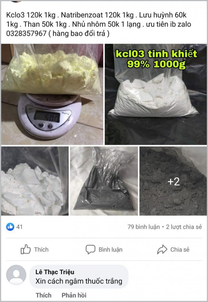 Các nguyên liệu để làm pháo tự chế được bán khá công khai trên mạng xã hội.