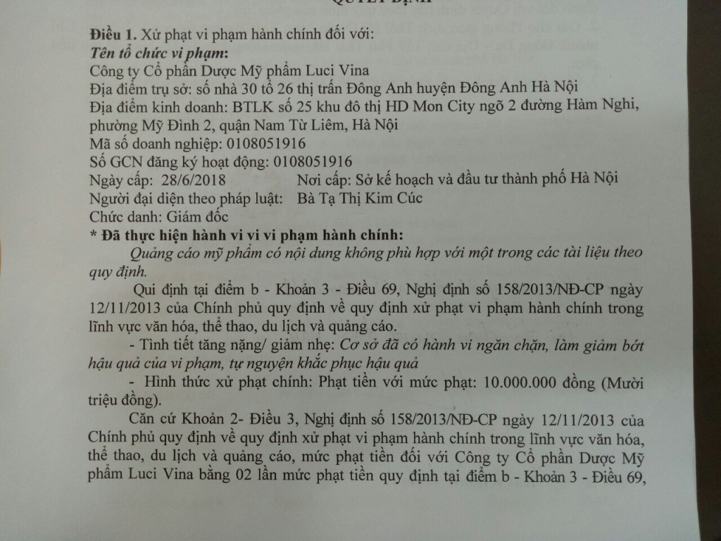Theo đó, ngày 30/5, Thanh tra Sở y tế Hà Nội đã ra quyết định số 185/QĐ-XPVHC xử phạt hành chính đối với công ty Dược mỹ phẩm Luci Vina có địa chỉ kinh doanh tại BTLK số 25 khu đô thị HD Mon City, ngõ 2 đường Hàm Nghi, Phường Mỹ Đình 2, quận Nam Từ Liêm, Hà Nội. Người đại diện theo pháp luật là bà Tạ Thị Kim Cúc, chức danh Giám đốc công ty.