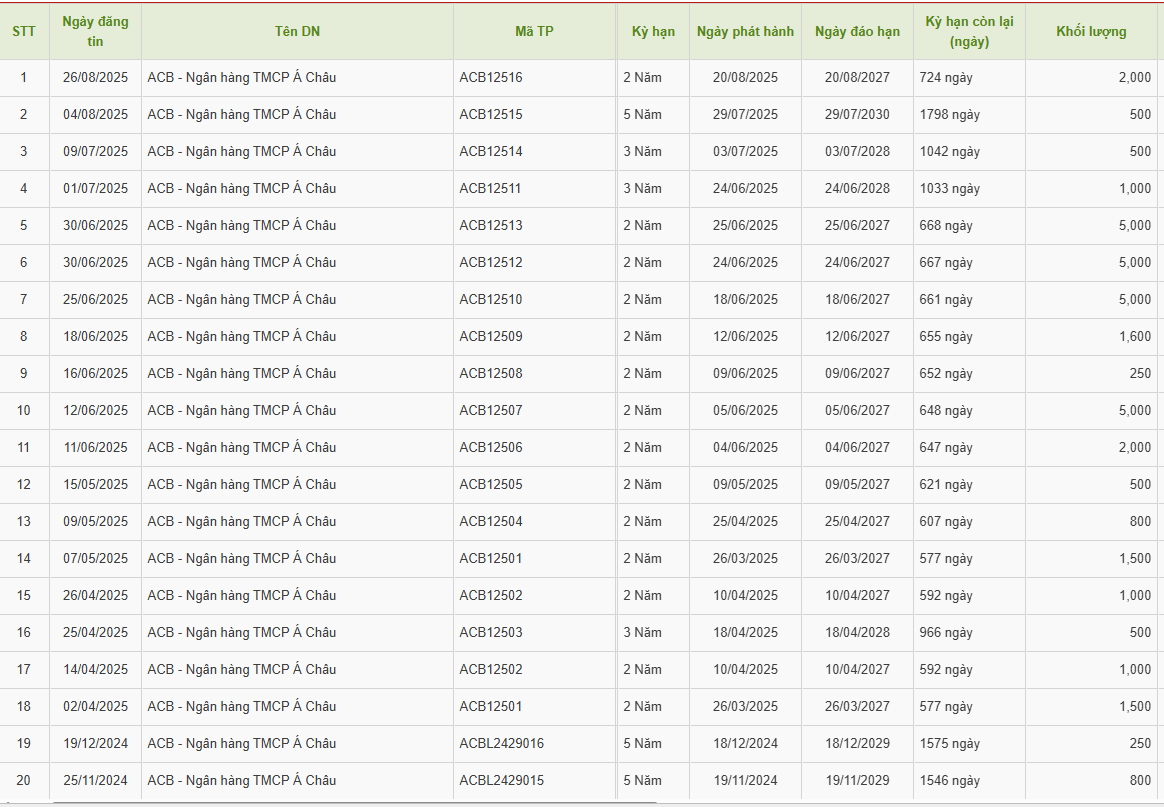 Theo thống kê từ Sở Giao dịch Chứng khoán Hà Nội (HNX), chỉ trong vòng 5 tháng qua, ACB đã phát hành 18 lô trái phiếu riêng lẻ với tổng giá trị hàng chục nghìn tỷ đồng. Các lô trái phiếu đều có mệnh giá từ 500 tỷ đến 5.000 tỷ đồng, kỳ hạn chủ yếu 2–3 năm, một số lô dài hơn đến 5 năm.