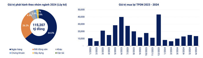 Lũy kế 6 tháng đầu năm có 102 đợt phát hành riêng lẻ trị giá 104.109 tỷ đồng và 10 đợt phát hành ra công chúng trị giá 11.378 tỷ đồng. Trái phiếu được phát hành nhiều nhất đến từ nhóm ngân hàng (64%), tiếp theo là bất động sản (26,2%).