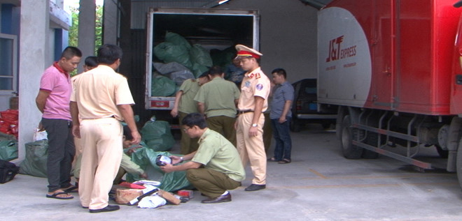 Lực lượng CSGT Thừa Thiên - Huế sau khi kiểm tra 2 xe tải của Công ty TNHH MTV chuyển phát nhanh Thuận Phong thì phát hiện một lượng lớn hàng lậu, không có nguồn gốc, không hóa đơn chứng từ.
