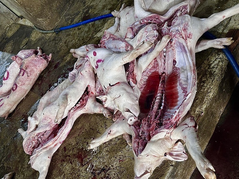 Cụ thể, lúc 13h30 ngày 8/12, lực lượng chức năng bất ngờ kiểm tra cơ sở giết mổ của ông Trương Duy Điệp (44 tuổi) làm chủ tại ấp Tây Nam (xã Gia Kiệm, H.Thống Nhất tỉnh Đồng Nai). Thời điểm kiểm tra, cơ sở này đang giết mổ 17 con heo chết với tổng trọng lượng hơn 650kg. Theo ghi nhận, heo được giết trên nền xi măng ẩm thấp, không đảm bảo vệ sinh, hầu hết các con heo đã biến đổi màu sắc, bốc mùi hôi thối.