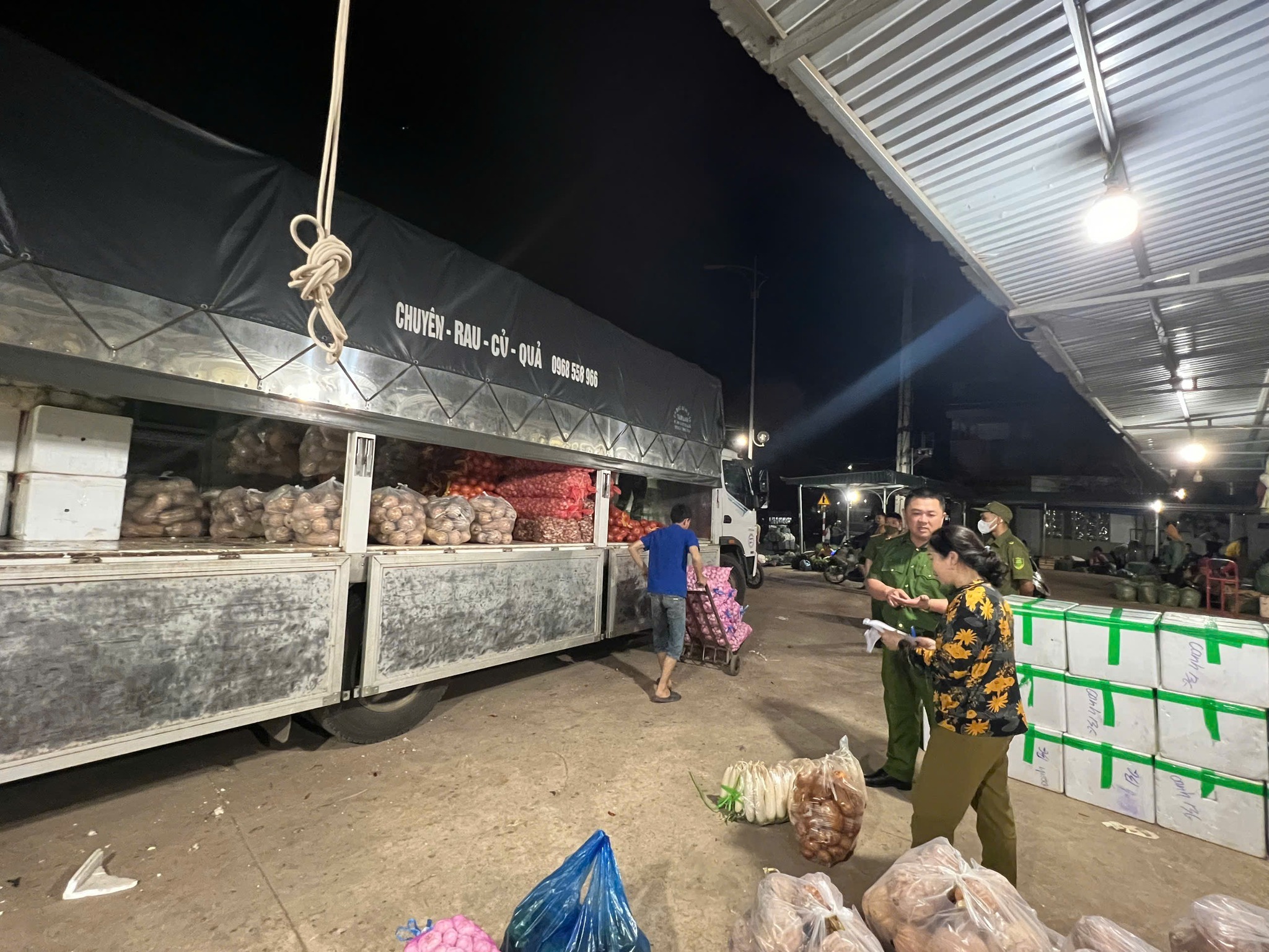 Khoảng 2h sáng ngày 7/5, Công an phường Chiềng Cơi phối hợp cùng UBND phường, lực lượng y tế và an ninh trật tự cơ sở tiến hành kiểm tra đột xuất chợ đêm bản Mé Ban - một khu chợ tự phát thường hoạt động về đêm và rạng sáng, thu hút nhiều tiểu thương buôn bán nông sản.