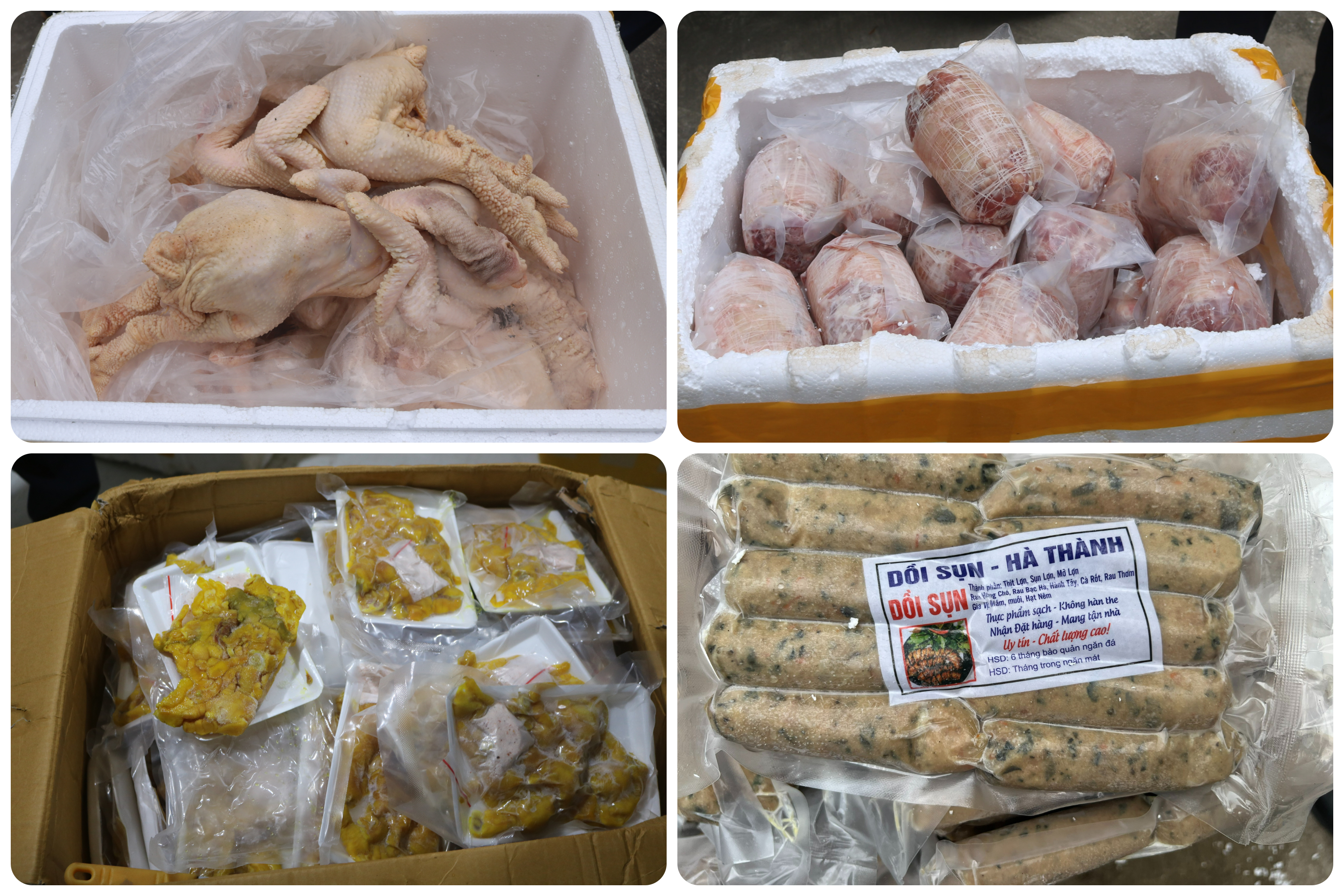 Qua kiểm tra, lực lượng chức năng phát hiện bên trong thùng xe chở 6,3 tấn hàng, được chia thành nhiều thùng xốp đựng các sản phẩm đông lạnh gồm: Thịt gà ủ muối, chân gà rút xương, chả sụn, chả cốm, giò heo rút xương... Ước tính giá trị số hàng khoảng 1 tỷ đồng.
