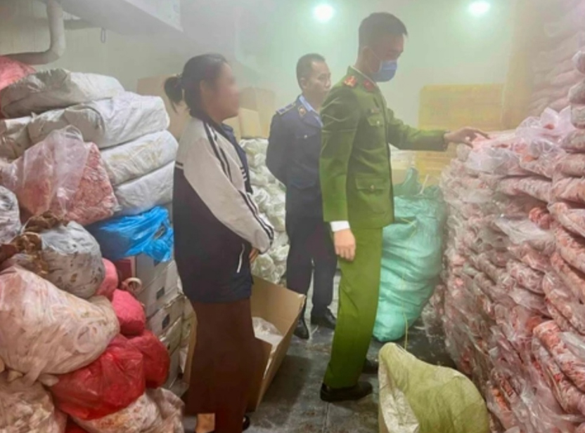 Đội 7 Phòng PC03 phối hợp với đội QLTT số 17 đã kiểm tra cơ sở tập kết và kinh doanh thực phẩm của ông Trần Văn Đức (41 tuổi, ở thôn Thuỵ Ứng, xã Hoà Bình, huyện Thường Tín).