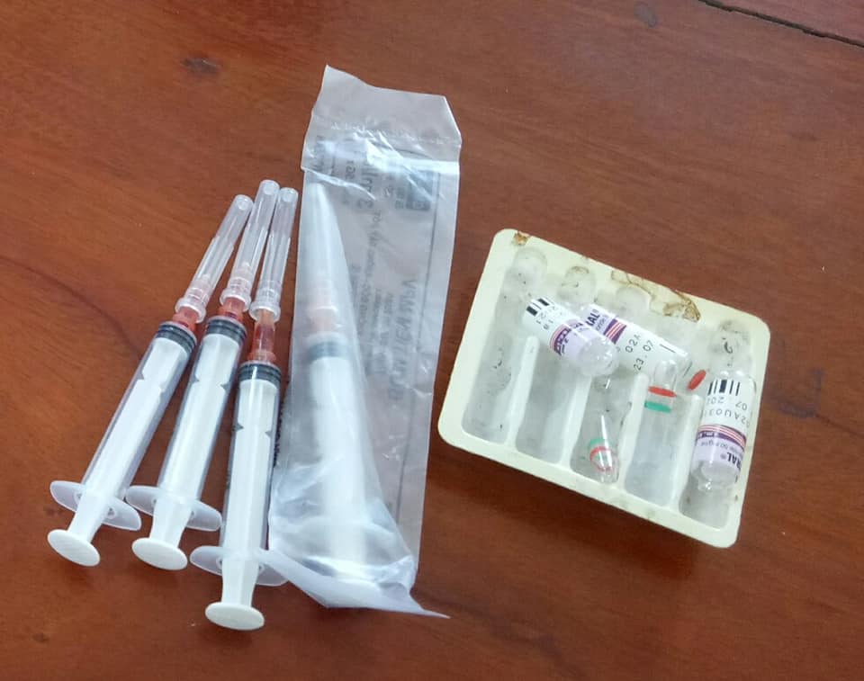 Công an huyện Thạch Hà, Hà Tĩnh thu giữ 5 ống thủy tinh bên trong chứa dung dịch trong suốt, bên ngoài có dòng chữ DOLCONTRAL và nhiều bơm kim tiêm các loại
