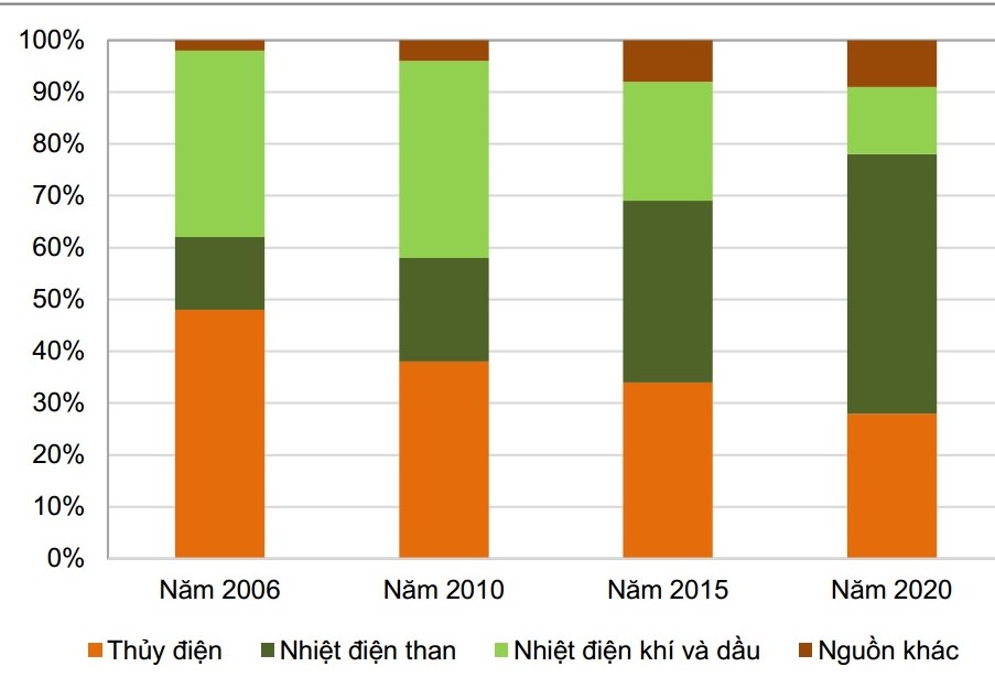 | Cơ cấu ngành điện giai đoạn 2006-2020 (nguồn: Báo cáo của ngành điện và Tổng sơ đồ điện VII, 2018) |