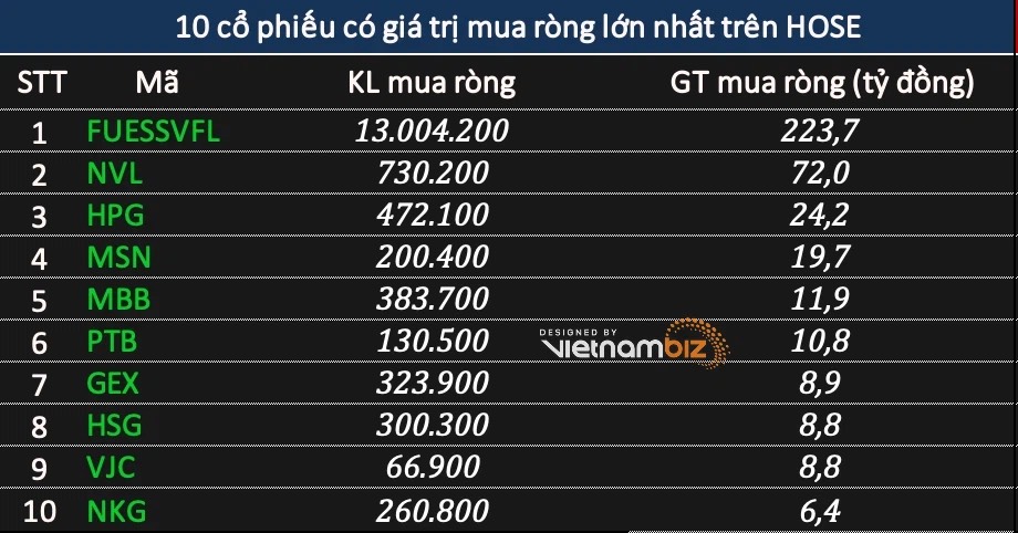 Top10 mã ghi nhận giá trị mua ròng cao, chứng chỉ quỹ FUESSVFL dẫn đầu với giá trị 223,7 tỷ đồng.