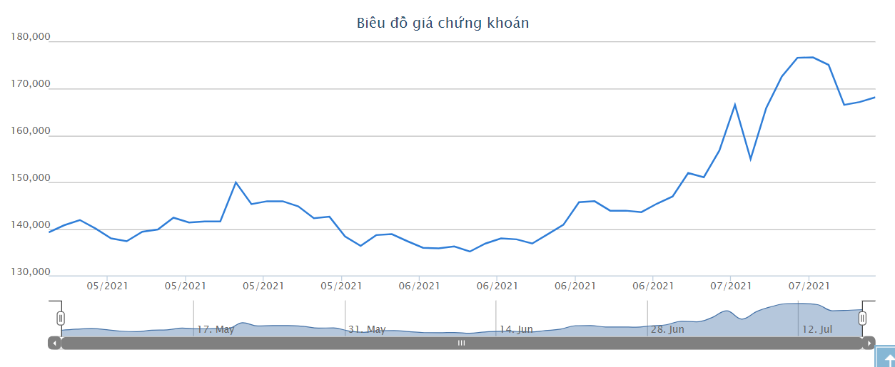 Chỉ tính riêng tháng 7/2021, cổ phiếu này đã tăng tới 17.100 đồng, tức tăng 11.04%.