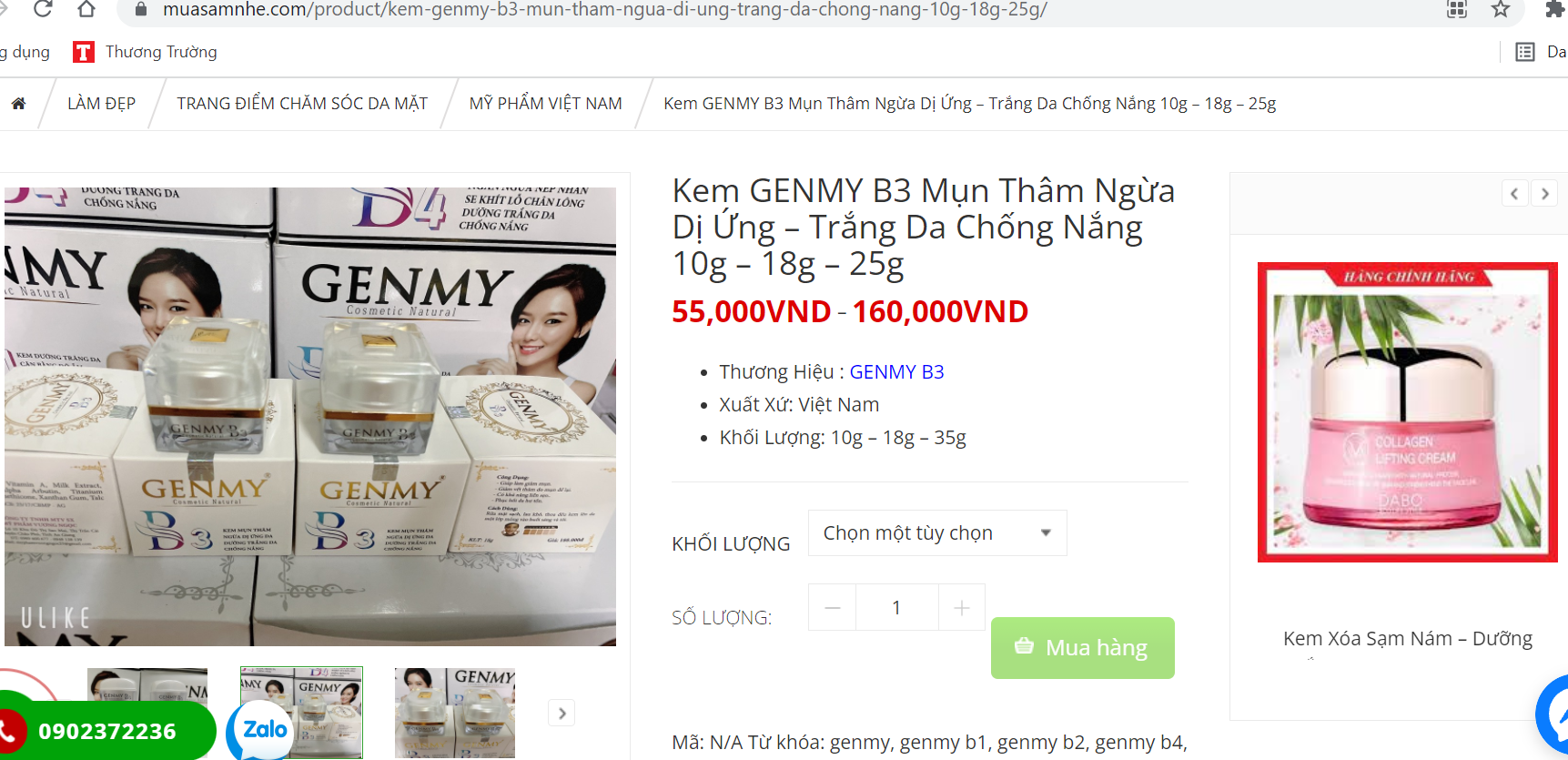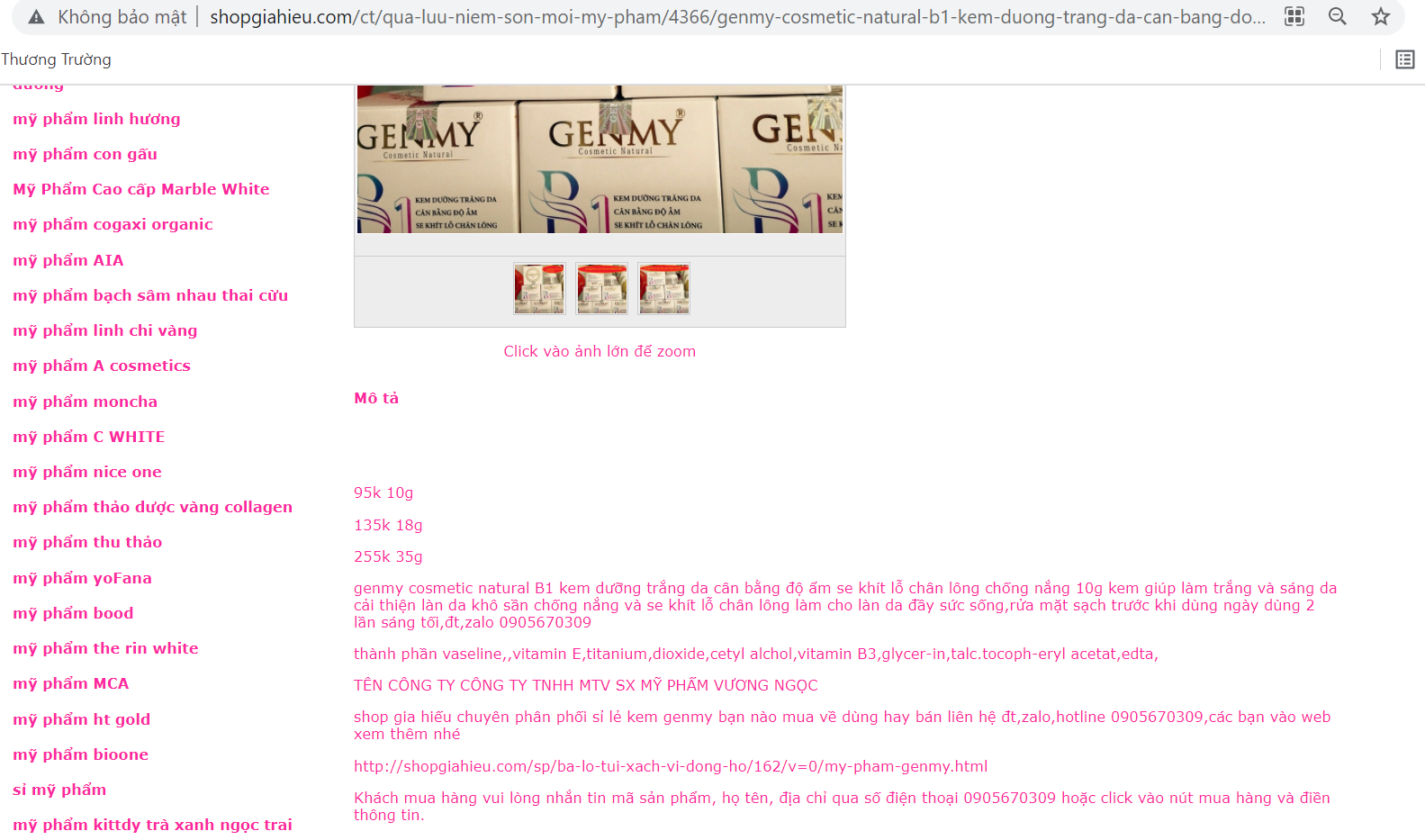 Cụ thể, tại các website shopgiahieu.com, myphamtrongthuy.com, muasamnhe.com đang bán những sản phẩm mỹ phẩm này. Mỗi một sản phẩm mỹ phẩm Vương Ngọc Hồng Tiên Thảo, Genmy, VECTA WHITE đang được rao bán có giá dao động từ 59.000 – 100.000 đồng/sản phẩm.
