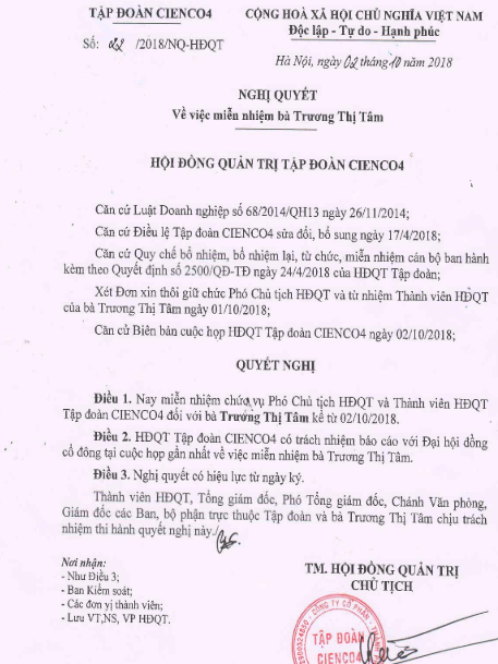 HĐQT và từ nhiệm Thành viên HĐQT Cienco 4 của bà Tâm trước đó.