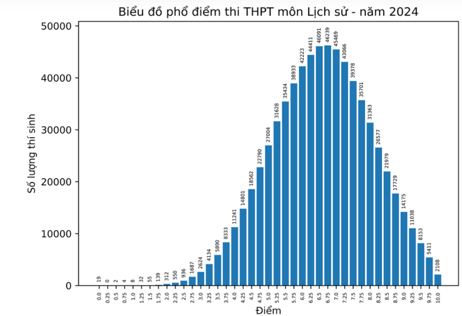 Môn lịch sử có điểm trung bình là 6,57 điểm (năm 2023 là 6,03 điểm). Điểm có nhiều thí sinh đạt được nhất là 6,75 điểm (năm 2023 là 5,75 điểm).