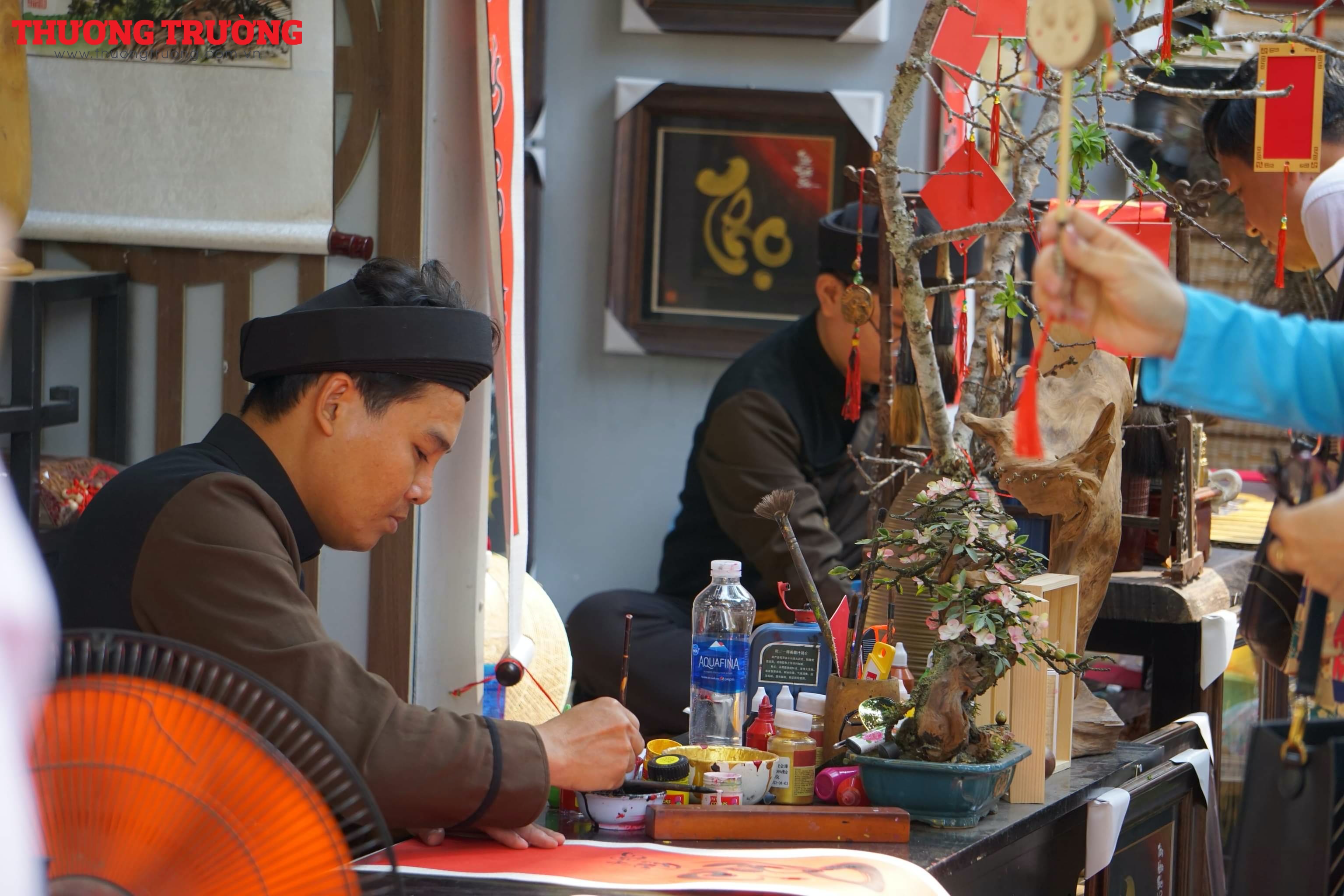 Các ông đồ, bà đồ luôn tất bật với công việc viết chữ, vẽ tranh để bán cho khách tham quan.