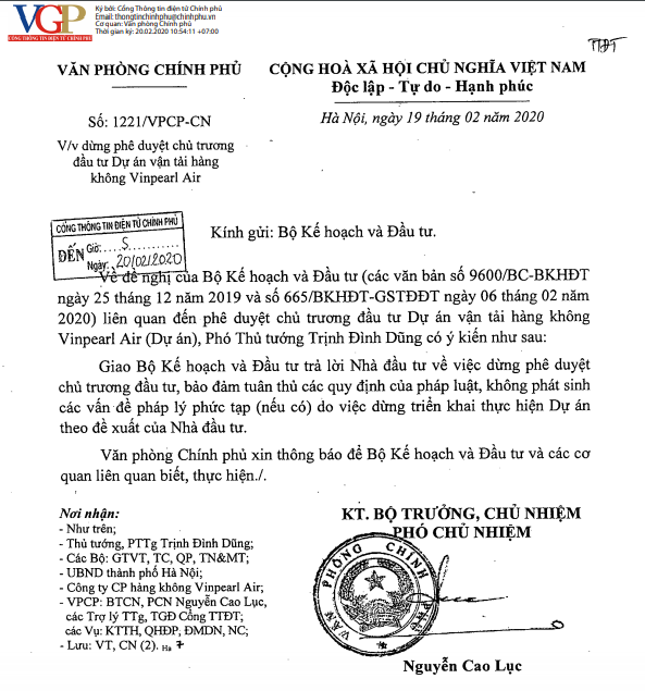 Theo Công văn trên, Phó Thủ tướng Trịnh Đình Dũng chỉ đạo về dự án này như sau: Xét đề nghị của Bộ Kế hoạch và Đầu tư liên quan đến chủ trương đầu tư Dự án vận tải hàng không Vinpearl Air, Phó Thủ tướng Trịnh Đình Dũng giao Bộ Kế hoạch và Đầu tư trả lời Nhà đầu tư về việc dừng phê duyệt chủ trương đầu tư, bảo đảm tuân thủ các quy định của pháp luật, không phát sinh các vấn đề pháp lý phức tạp (nếu có) do việc dừng triển khai thực hiện dự án theo đề xuất của Nhà đầu tư.