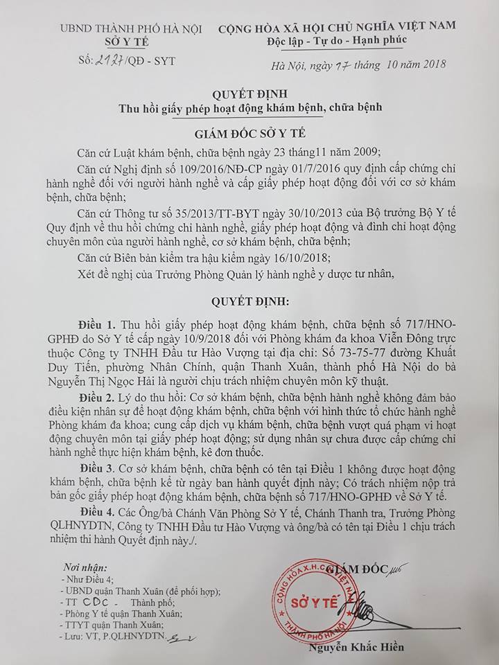 | Sở Y tế Hà Nội ra quyết định thu hồi giấy phép hoạt động của Phòng khám đa khoa Viễn Đông. |