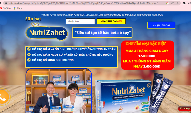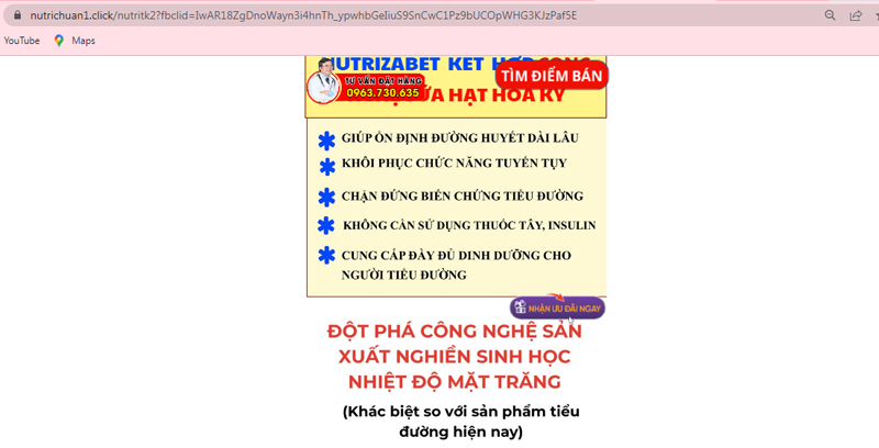 Ở một website khác là https://www.nutrichuan1.click/, sản phẩm NutriZabet lại quảng cáo "Khôi phục chức năng tuyến tụy, chặn đứng biến chứng tiểu đường". Hay “Đột phá công nghệ sản xuất nghiền sinh học, nhiệt độ mặt trăng”. Tại trang web này, tổ chức kinh doanh đã chia sẻ hàng loạt tâm thư, hình ảnh của khách hàng (chưa được kiểm chứng) với lời “có cánh” nhằm quảng cáo sai công dụng, đánh vào tâm lý người bệnh tiểu đường.