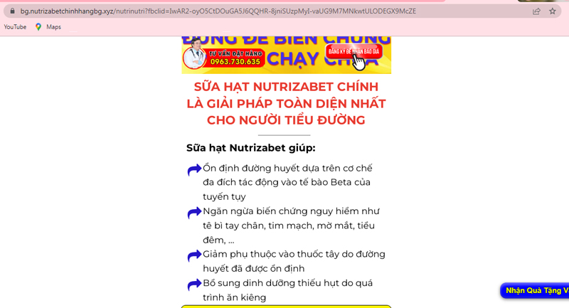 Sau tiếp nhận thông tin phản ánh từ độc giả qua tìm hiểu của phóng viên, cho thấy trên website https://bg.nutrizabetchinhhangbg.xyz/ vẫn quảng cáo sản phẩm sữa hạt NutriZabet xua tan nỗi lo tiểu đường, ngăn ngừa biến chứng, ổn định đường huyết. Đặc biệt, sữa hạt NutriZabet còn giúp: "Ổn định đường huyết dựa trên cơ chế đa đích tác động vào tế bào Beta của tuyến tụy; Ngăn ngừa biến chứng nguy hiểm như tê bì tay chân, tim mạch, mờ mắt, tiểu đêm,... Đồng thời, cam kết sử dụng hiệu quản - tiểu đường không phụ thuộc thuốc tây - giảm tiêm Insulin - đường huyến ổn định bền vững.