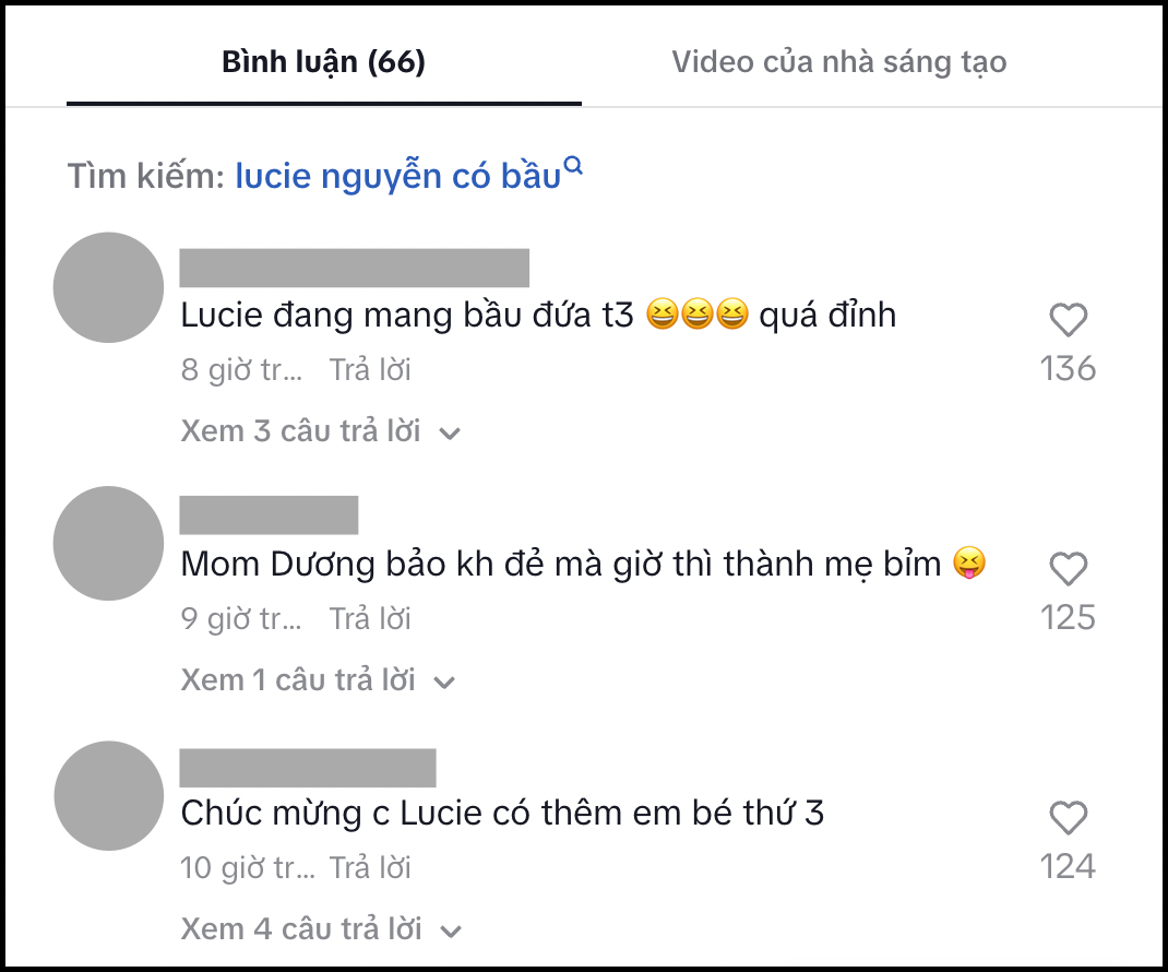 Trước những lời bàn tán của cộng đồng mạng, phía Lucie Nguyễn - Tuấn Dương, quản lý của cặp đôi xác nhận rằng thông tin này chưa chính xác, Lucie Nguyễn không mang thai. Có thể, đây chỉ là khoảnh khắc vui đùa đáng nhớ trong tiệc sinh nhật của hot mom mà thôi.
