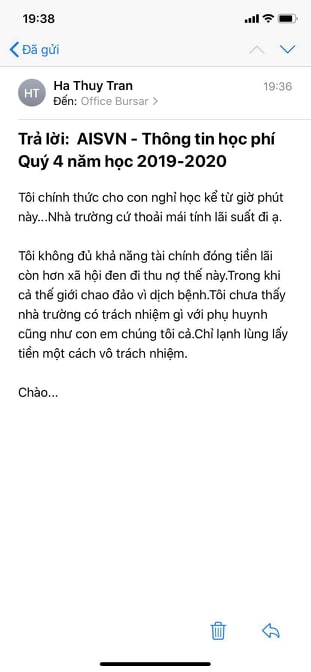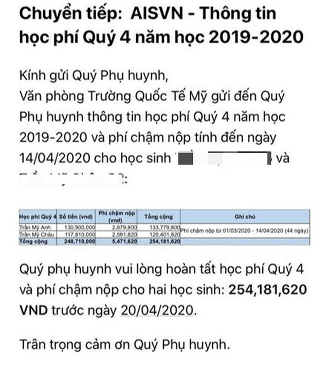 Thế nhưng mới đây, trường Quốc tế Mỹ vẫn gửi thông báo tới chị T về việc thu học phí quý 4 cho 2 con.