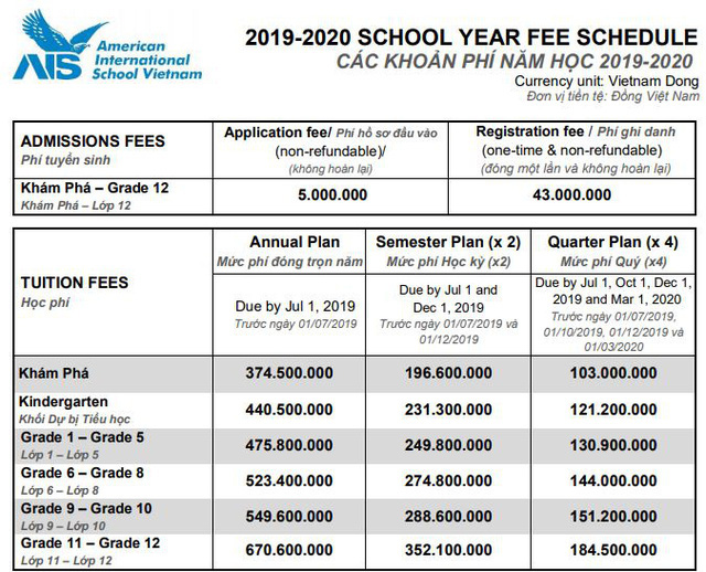 Bảng học phí của Trường Quốc Tế Mỹ (AISVN)