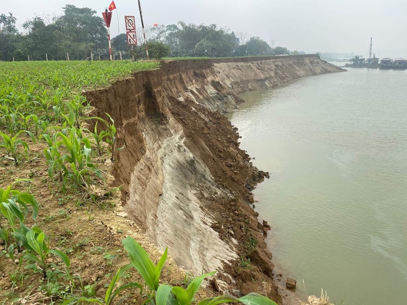 Hàng nghìn m2 đất canh tác đã trôi xuống dòng sông. Điểm sạt lở cao từ 3 - 4m, dài hàng trăm mét và ngày càng lan rộng, ăn dần vào những cánh đồng sản xuất của người dân. Hoạt động khai thác cát, sỏi tràn lan khiến người dân ven sông Lô thuộc địa phận xã Bình Phú không khỏi lo lắng.