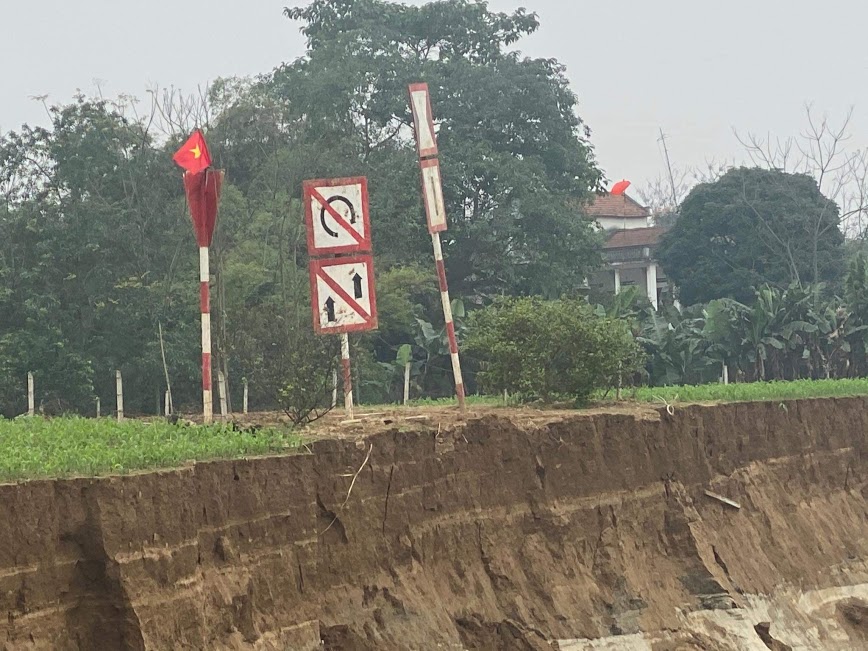Điểm báo đường sông đang bị "đe dọa" khi bờ sông đã bị sạt lở sát vào chân cột