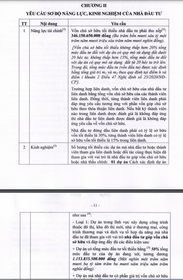 Theo quyết định số 1404/QĐ-UBND của UBND tỉnh Phú Thọ, yêu cầu sơ bộ năng lực, kinh nghiệm nhà đầu tư có các điểm đáng chú ý như năng lực tài chính của chủ sở hữu tối thiểu phải thu xếp là hơn 346 tỷ đồng. Về kinh nghiệm, số lượng tối thiểu các dự án mà nhà đầu tư hoặc thành viên tham gia liên danh đã tham gia với vai trò nhà đầu tư góp vồn sở hữu hoặc nhà thầu chính là 01 dự án.