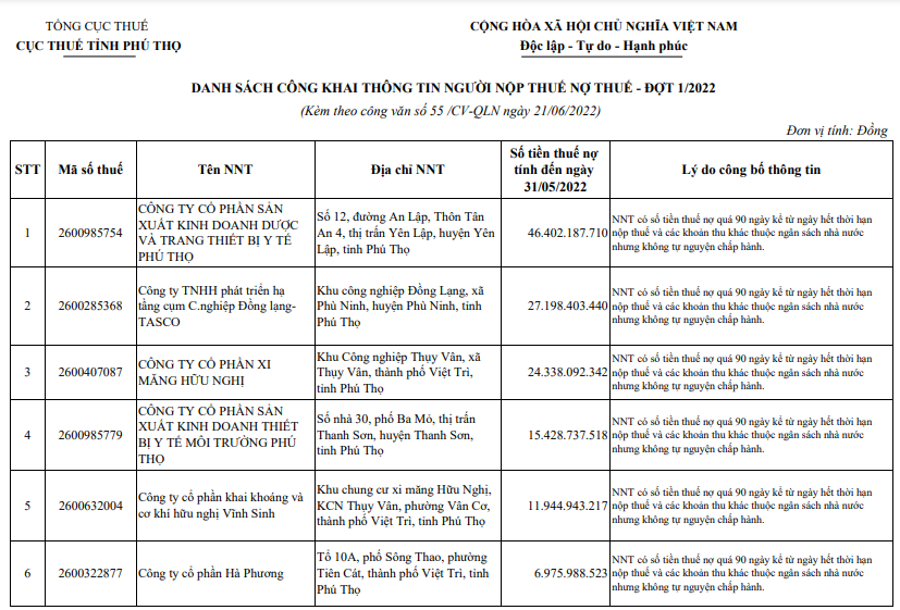 Mới đây, Cục thuế tỉnh Phú Thọ vừa có danh sách công khai thông tin người nộp thuế nợ thuế tính đến thời điểm 31/5/2022 (đợt 1 - 2022).