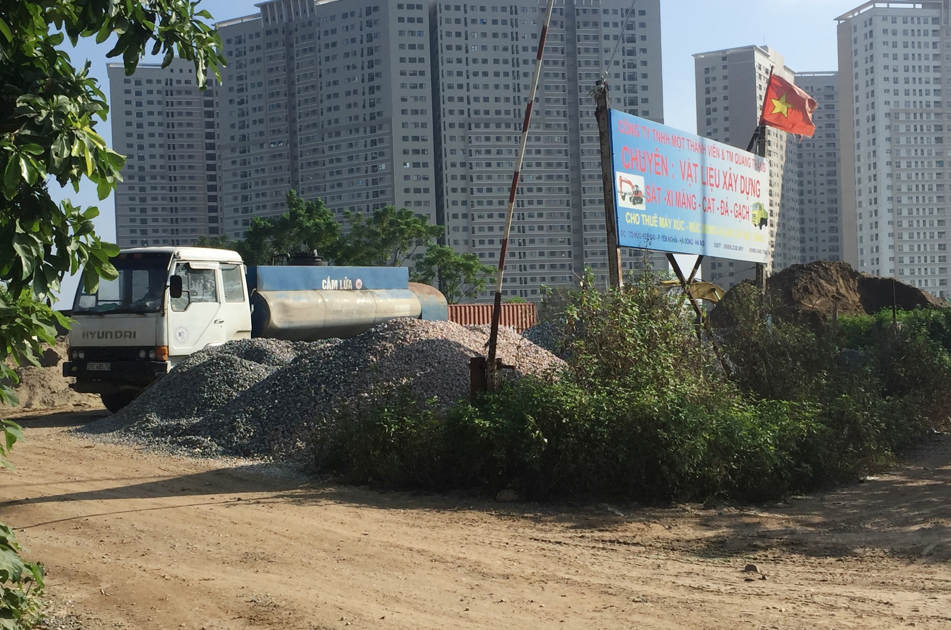 Bãi vật liệu xây dựng kết hợp điểm đỗ của các xe téc vận chuyển xăng nằm sát trường học