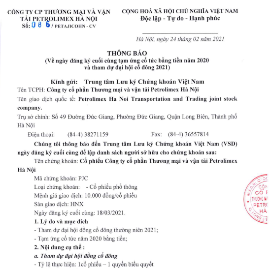 CTCP Thương mại và Vận tải Petrolimex Hà Nội (MCK: PJC – sàn HNX) vừa thông báo về việc tổ chức ĐHCĐ thường niên năm 2021 và tạm ứng cổ tức năm 2020 bằng tiền mặt.