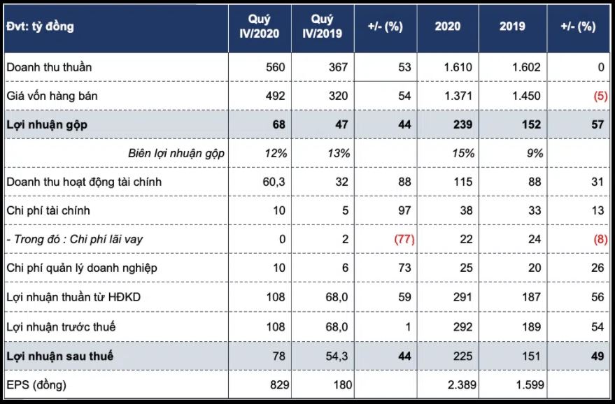 Năm 2020, công ty đặt mục tiêu 1.650 tỷ đồng doanh thu, 168 tỷ đồng lãi sau thuế. Như vậy, công ty mới đạt 97,5% kế hoạch doanh thu nhưng đã vượt 34% mục tiêu lợi nhuận năm.