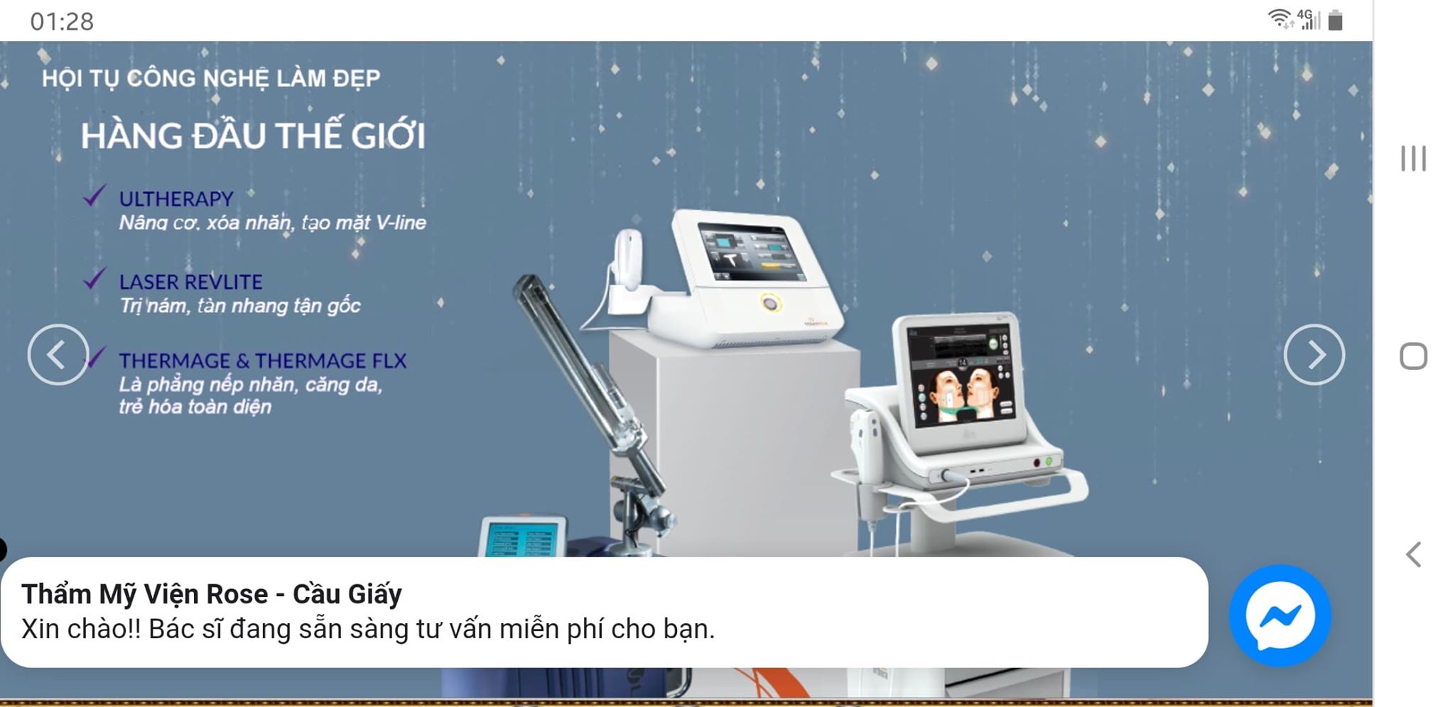 Dù chỉ là một cơ sở dịch vụ thẩm mỹ nhưng lại trang bị những công nghệ làm đẹp được giới thiệu là "hàng đầu thế giới" tại website: thammyvienrose.com (Ảnh màn hình)Việc các cơ sở trên nếu có quảng cáo như thông tin mà PV nêu là sai, thẩm quyền kiểm tra và xử lý thuộc UBND quận Cầu Giấy do đã phân cấp theo chỉ đạo của UBND TP. Hà Nội. Sở Y tế sẽ vào cuộc khi có sự vụ xảy ra.