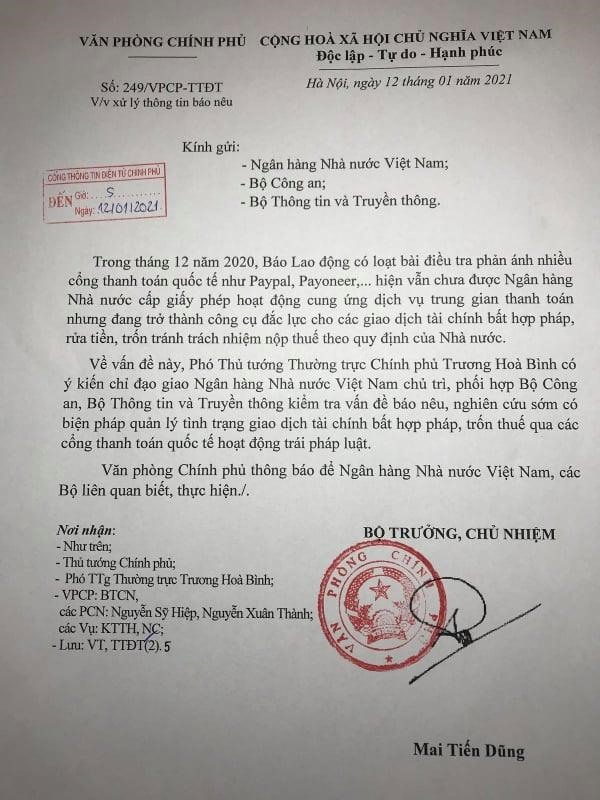 Nội dung công văn nêu rõ: "Phó Thủ tướng Thường trực Chính phủ Trương Hòa Bình giao Ngân hàng Nhà nước Việt Nam chủ trì, phối hợp với một số Bộ nghiên cứu sớm có biện pháp quản lý tình trạng giao dịch tài chính bất hợp pháp, trốn thuế qua các cổng thanh toán quốc tế hoạt động trái pháp luật.