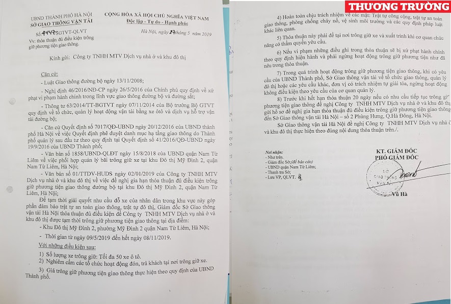 Căn cứ vào các quy định, thông tư của pháp luật hiện hành, ngày 27.5.2019 Sở Giao thông vận tải TP. Hà Nội đã ra văn bản số 4447/SGTVT-QLVT chấp thuận cho Công ty TNHH MTV Dịch vụ nhà ở và đô thị được tạm thời trông giữ phương tiện giao thông (tối đa 50 xe ô tô) tại KĐT Mỹ Đình 2 để giải quyết nhu cầu đỗ xe của nhân dân trong khu vực, đồng thời góp phần đảm bảo trật tự ATGT, trật tự đô thị. Văn bản có hiệu lực từ 9.5.2019 đến 8.11.2019.